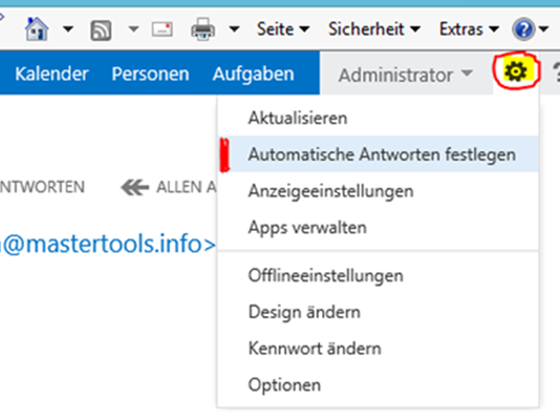 Bei allen Arten von Exchange existiert meist ein Zugang per "Web-Mail", genannt Outlook Web App (füher Outlook Web Access - OWA). Im Web App können Sie die "Automatischen Anworten" ebenfalls konfigurieren. Klicken Sie dazu nach dem Login oben rechts auf das Zahnrad um die Einstellungen aufzurufen: